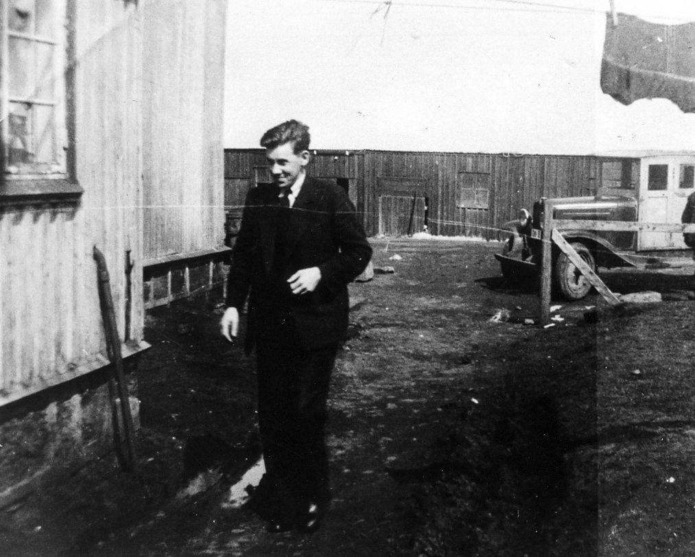Friðrik Þorsteinsson á gangi við hús, í baksýn er gamall bíll og þvottur á snúru.