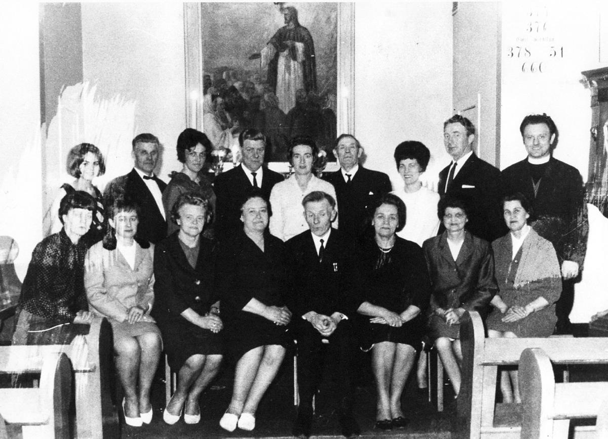 Kór Keflavíkurkirkju? um 1966? og sr. Björn Jónsson. Efriröð f.v. Sigrún Ósk Ingadóttir?, Bergsteinn Sigurðsson, Sigríður Aðalsteinsdóttir, Ólafur Guðmundsson, Hallbera Pálsdóttir, Þorsteinn Árnason, Karitas Finnbogadóttir, Böðvar Pálsson og sr. Björn Jónsson. Fremri röð f.v. Dagmar Pálsdóttir, Sólveig Ólafsdóttir, Guðrún Bergmann, Sólrún Vilhjálmsdóttir, Geir Þorsteinsson, organisti, Sesselja Magnúsdóttir, Þórunn Jónsdóttir og Jónína Jónsdóttir.