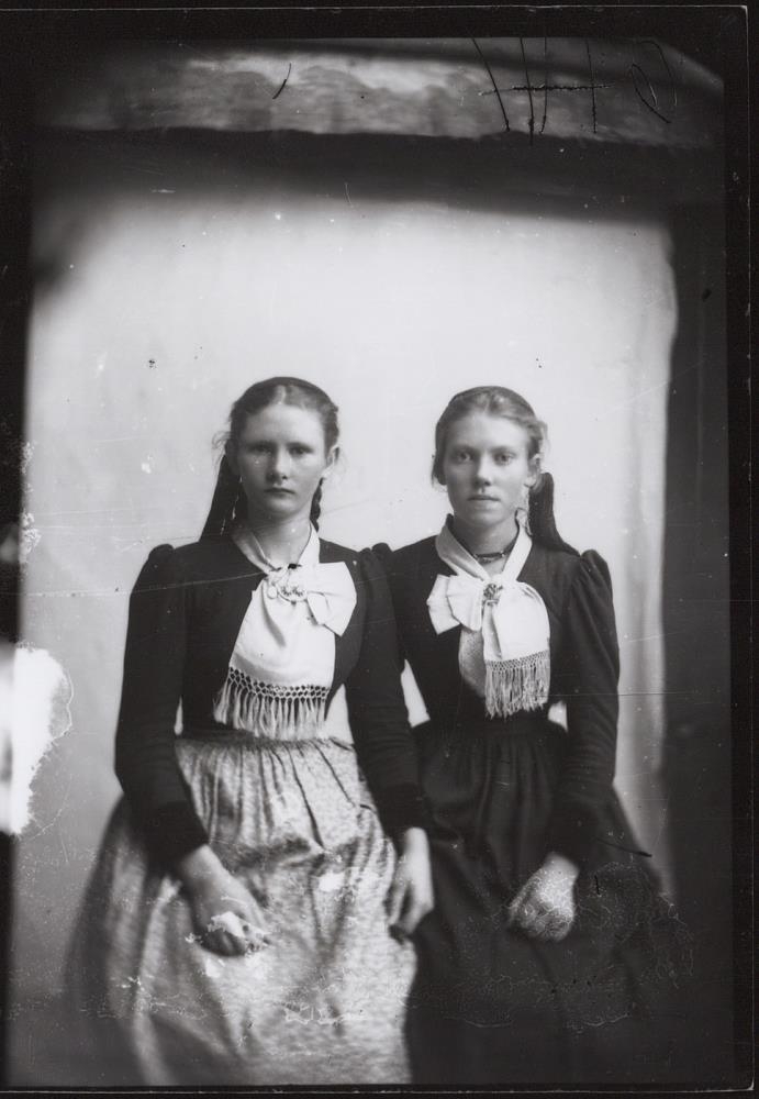 Tvær ungar konur í peysufötum. T.v. er Elísabet Guðmundsdóttir frá Æðey við Ísafjarðardjúp. T.h. er Jósefína Helga Bjarnadóttir frá Ármúla við Ísafjarðardjúp, síðar húsfreyja og kennari í Bolungarvík.