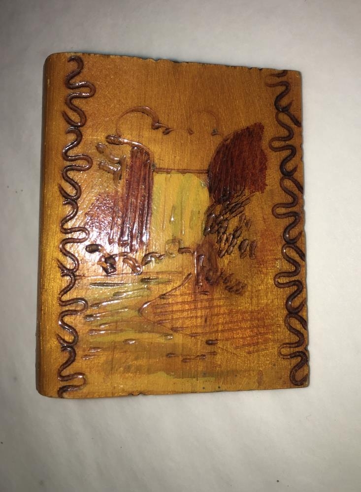 Hluti af tréhylki um eldspýtnastokk og á grafin mynd af Skógafossi. Verk Helgu Pálsdóttur í handavinnu í Skógaskóla.
