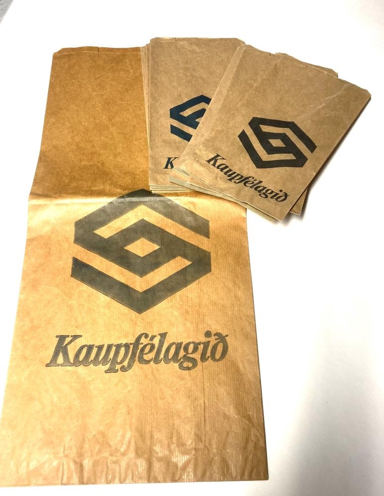 Bréfpokar 1 stærri og 17 litlir, innkaupapokar frá Kaupfélagi Rangæinga.. Merki SÍS og "Kaupfélagið" í bláum lit, á annari hlið pokanna.Hluti af munum frá Kaupfélagssafninu á Hvolsvelli sem lagt var niður árið 2024.