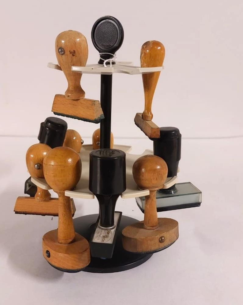 Stimplastatíf af gerðinni TRODAT, á tveimur hæðum og tekur alls 16 stimpla. Með statífinu fylgja 10 stimplar frá Kaupfélagi Rangæinga á Hvolsvelli af ýmsum stærðum og gerðum og tengjast rekstri K.R. Hluti af munum frá Kaupfélagssafninu á Hvolsvelli sem lagt var niður árið 2024.