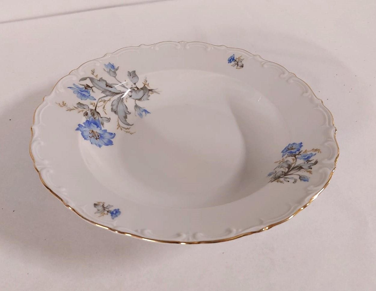 Súpudiskur, hvítur með bláu blómamynstri og gylltum jöðrum. Merkt SÍS á botni. Hluti af munum frá Kaupfélagssafninu á Hvolsvelli sem lagt var niður árið 2024.
