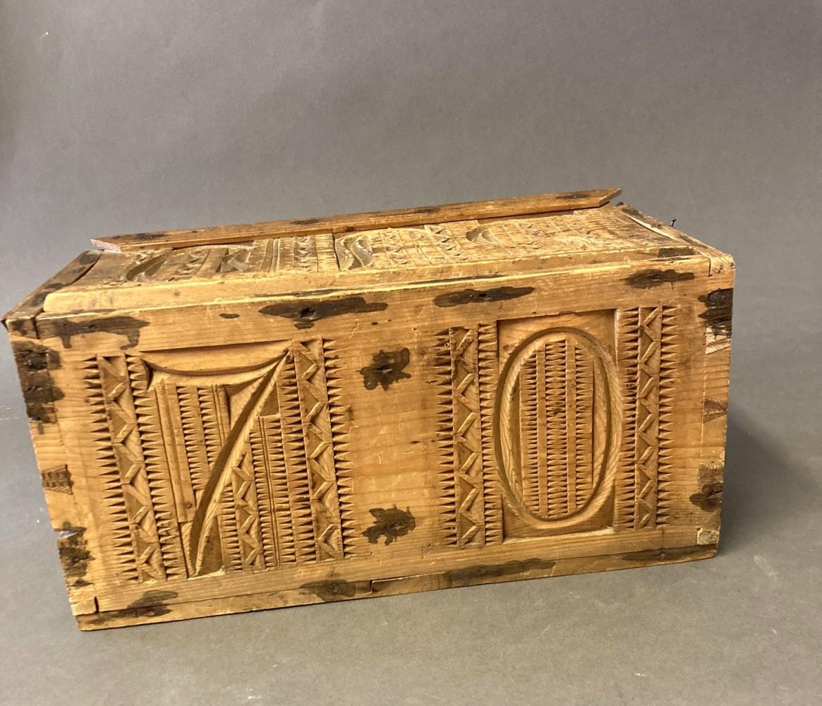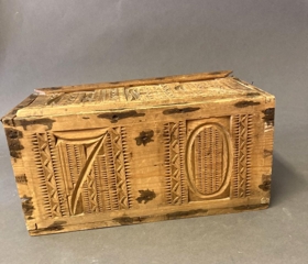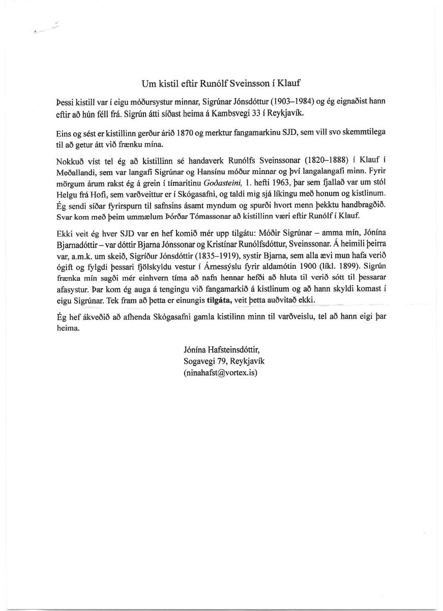 Útskorinn kistill. Á loki er skorið út fangamarkið SJD, á framhlið 18 og bakhlið 70. Á hliðum eru útskorið blómamynstur. Verk Runólfs Sveinssonar (1820-1888) í Klauf í Meðallandi, langalangafa gefanda, Jónínu Hafsteinsdóttur Reykjavík. Kistillinn var áður í eigu móðursystur Jónínu, Sigrúnar Jónsdóttur (1903-1984).