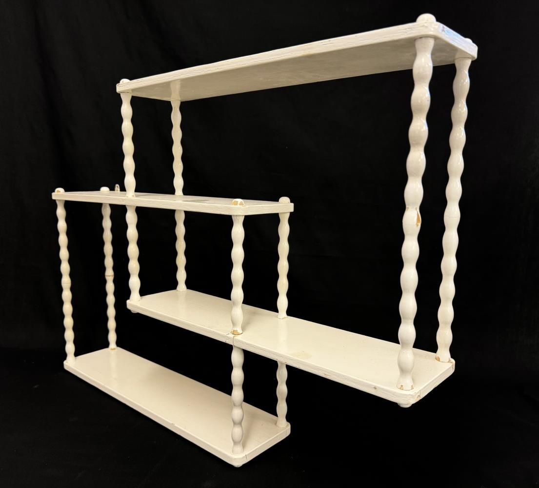 Hilla úr tré, hvítmáluð. Hillan er með tveimur grunnflötum og fjórum ,,súlum,, upp frá hverju horni. Efri hillan skarast við þá neðri svo það myndast eins og lítil hilla inní tveimur hillum.