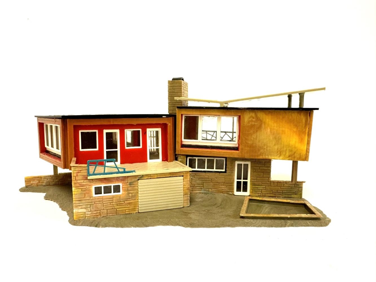 Lítið líkan úr plasti af húsi. Húsið er í funkis stíl, með bæði flötu og hallandi þaki og skorsteini á milli húslutanna tveggja sem mynda húsið.