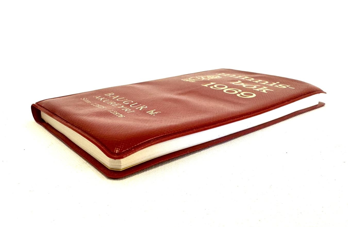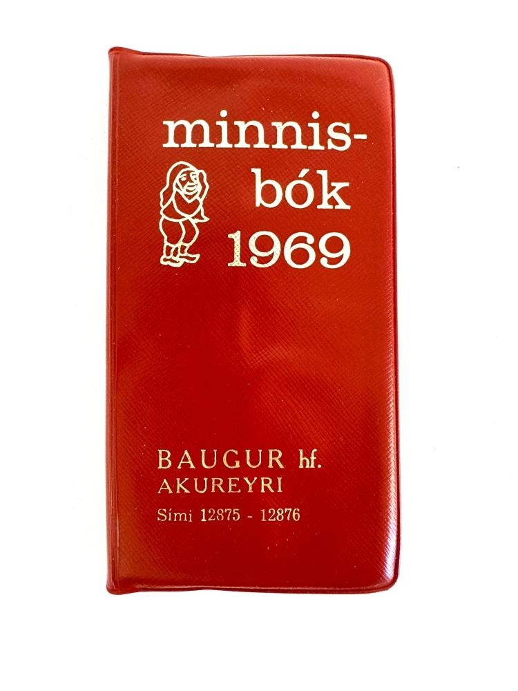 Rauð minnisbók / dagbók frá árinu 1969. Á kápunni er fígúra sem minnir á jólasvein og á henni stendur : minnisbók 1969. Baugur hf. Akureyri sími 12875 - 12876. Í svona bókum voru jafnan dálkar fyrir hvern dag vikunnar á hverri blaðsíðu eða opnu. Einnig ýmsar hagnýtar upplýsingar eins og landakort og bæjar-/ götukort. Mælieiningalistar, almanaksyfirlit og hátíðisdagar, fánar þjóða ofl.