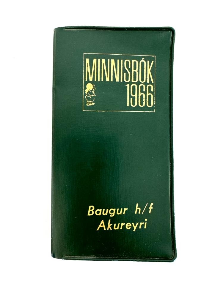 Græn minnisbók / dagbók frá árinu 1966. Á kápunni er fígúra sem minnir á jólasvein og á henni stendur : minnisbók 1966. Baugur hf. Akureyri. Í svona bókum voru jafnan dálkar fyrir hvern dag vikunnar á hverri blaðsíðu eða opnu. Einnig ýmsar hagnýtar upplýsingar eins og landakort og bæjar-/ götukort. Mælieiningalistar, almanaksyfirlit og hátíðisdagar, fánar þjóða ofl.