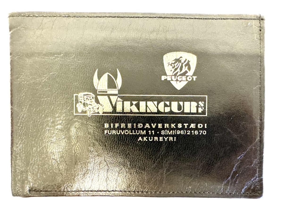 Svart seðlaveski ferkantað og þunnt. Er úr leðurefni, innan í því er plastgluggi fyrir einu hólfinu og því er skipt upp í nokkur hólf fyrir seðla eða miða. Utan á veskinu er gyllt áletrun og mynd. Á því stendur : Víkingur hf. Bifreiðaverkstæði Furuvöllum 11. Sími (96)21670. Akureyri. Ofan á V - inu í nafni fyrirtækisins er víkingahjálmur með tveimur hornum. Við hliðina á nafninu er mynd af bíl. Fyrir ofan nafnið er merki bílaframleiðandans Peugeot (ljón)