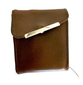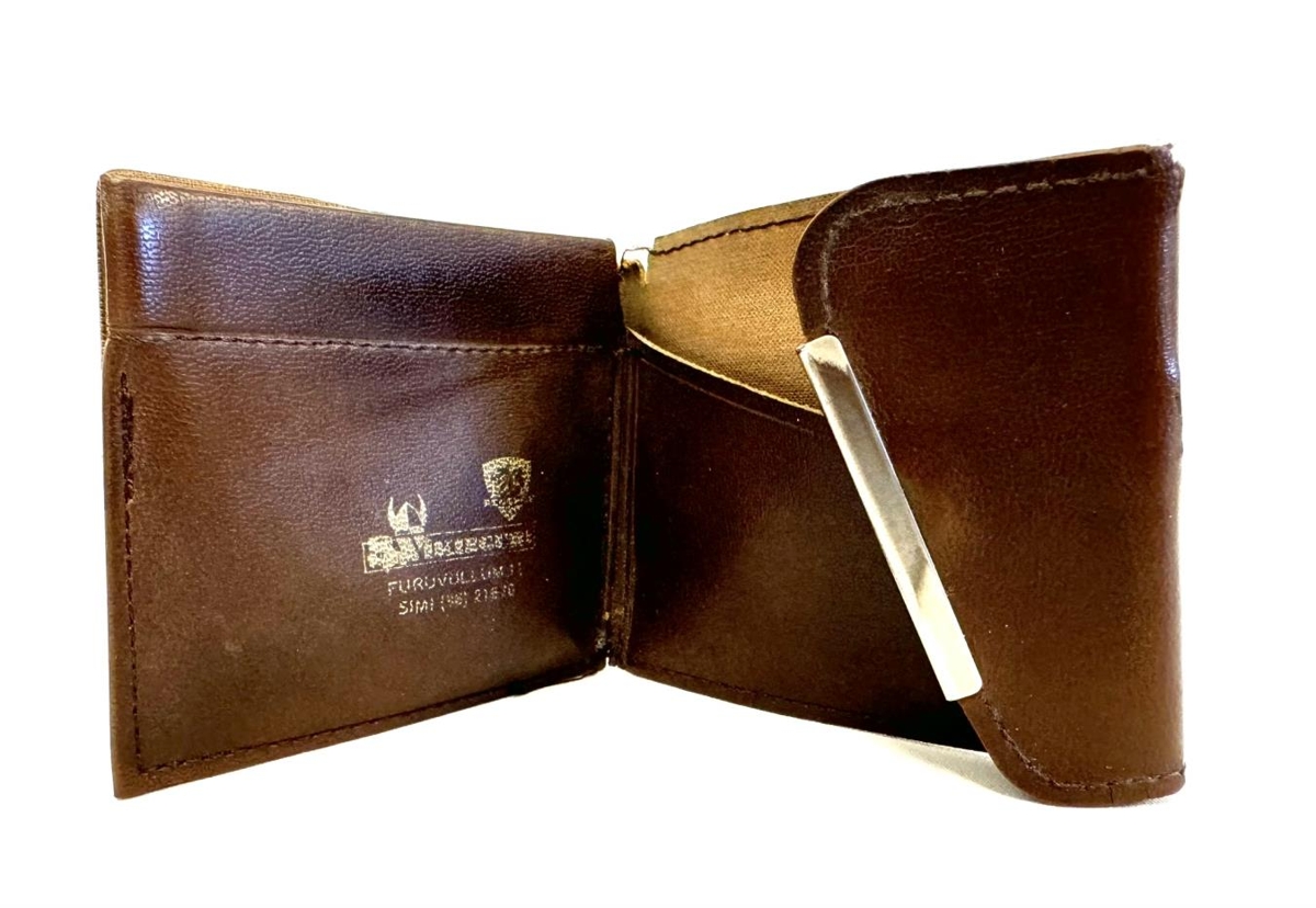 Brúnt peningaveski með gylltum málmi sem smellir því saman. Er úr leðurefni, því er skipt upp í nokkur hólf fyrir seðla eða miða. Innan í veskinu er gyllt áletrun og mynd. Á því stendur : Víkingur hf. Bifreiðaverkstæði Furuvöllum 11. Sími (96)21670. Akureyri. Ofan á V - inu í nafni fyrirtækisins er víkingahjálmur með tveimur hornum. Við hliðina á nafninu er mynd af bíl. Fyrir ofan nafnið er merki bílaframleiðandans Peugeot (ljón).