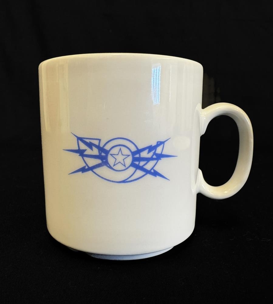 Bolli og diskur, hvítt sett með bláu merki Pósts og síma. Bollinn er um 10x7x8 cm og diskurinn 19x19x1,5cm að stærð.