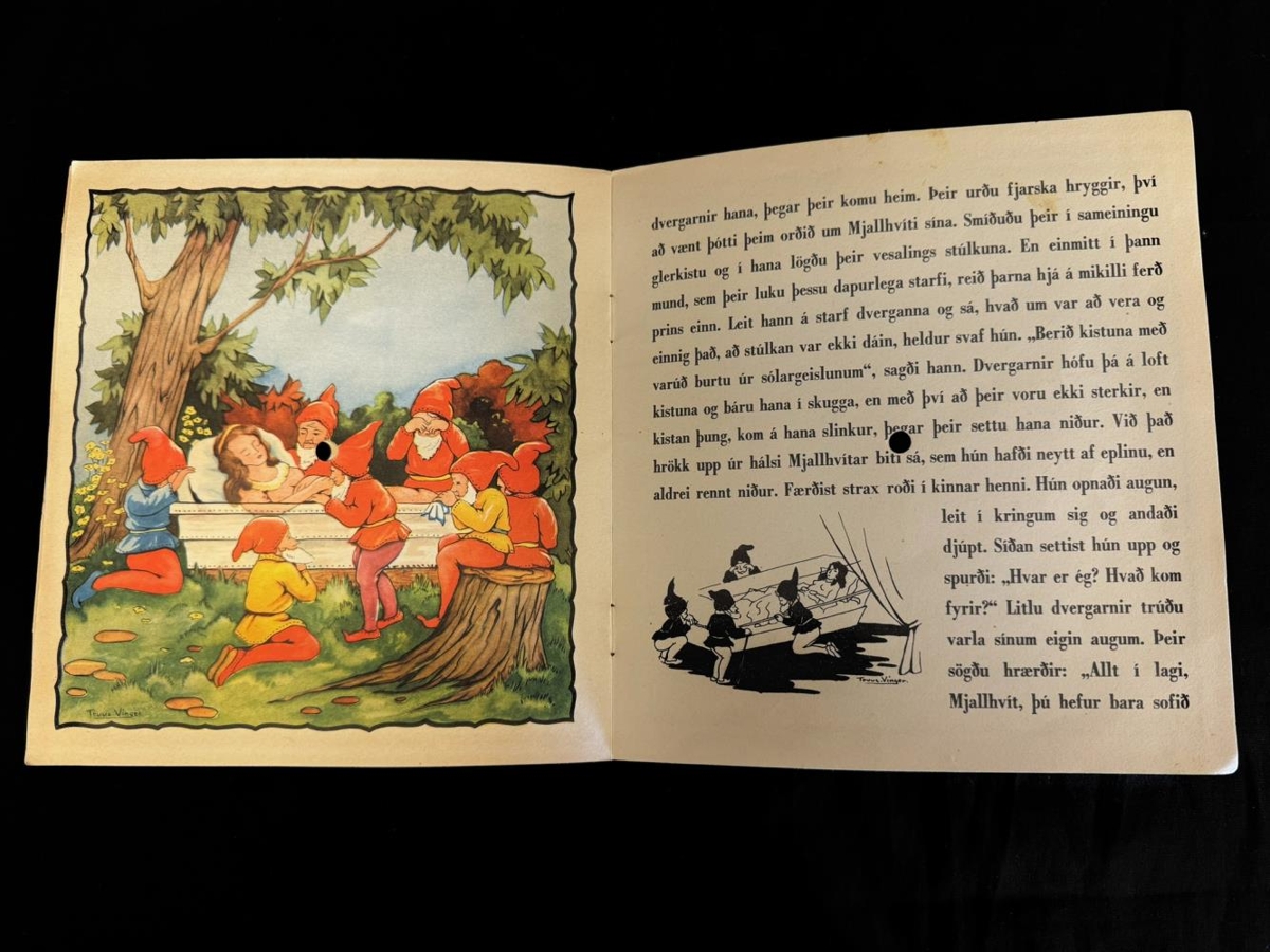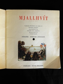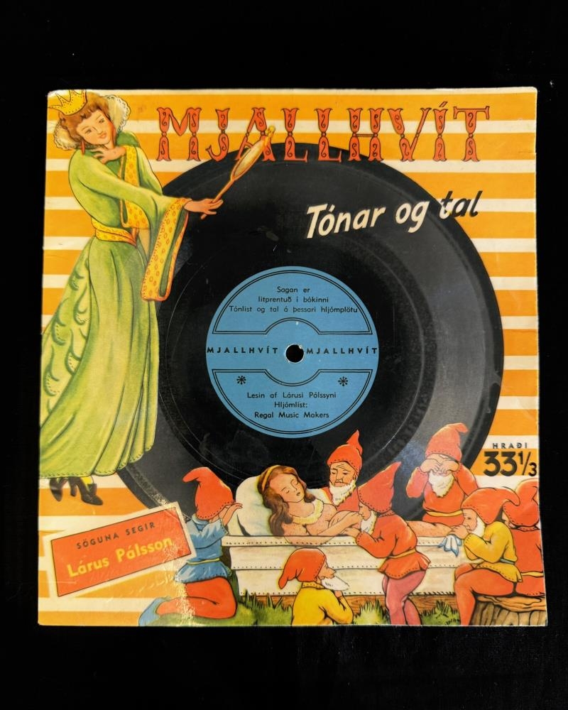 Bók og plata. Á forsíðu stendur : Mjallhvít - Tónar og tal. Sagan er litprentuð í bókinni. Tónlist og tal á þessari hljómplötu. Lesin af Lárusi Pálssyni. Hljómlist: Regal Music Makers. Hraði 33 1/3. Á forsíðu stendur: Mjallhvít. Í þessum bókaflokki eru komin út eftirtalin ævintýri: Rauðhetta. Hans og Gréta. Mjallhvít. Þyrnirós. Þýðandi: Stefán Jónsson. Útgefandi: Ingvar Helgason.