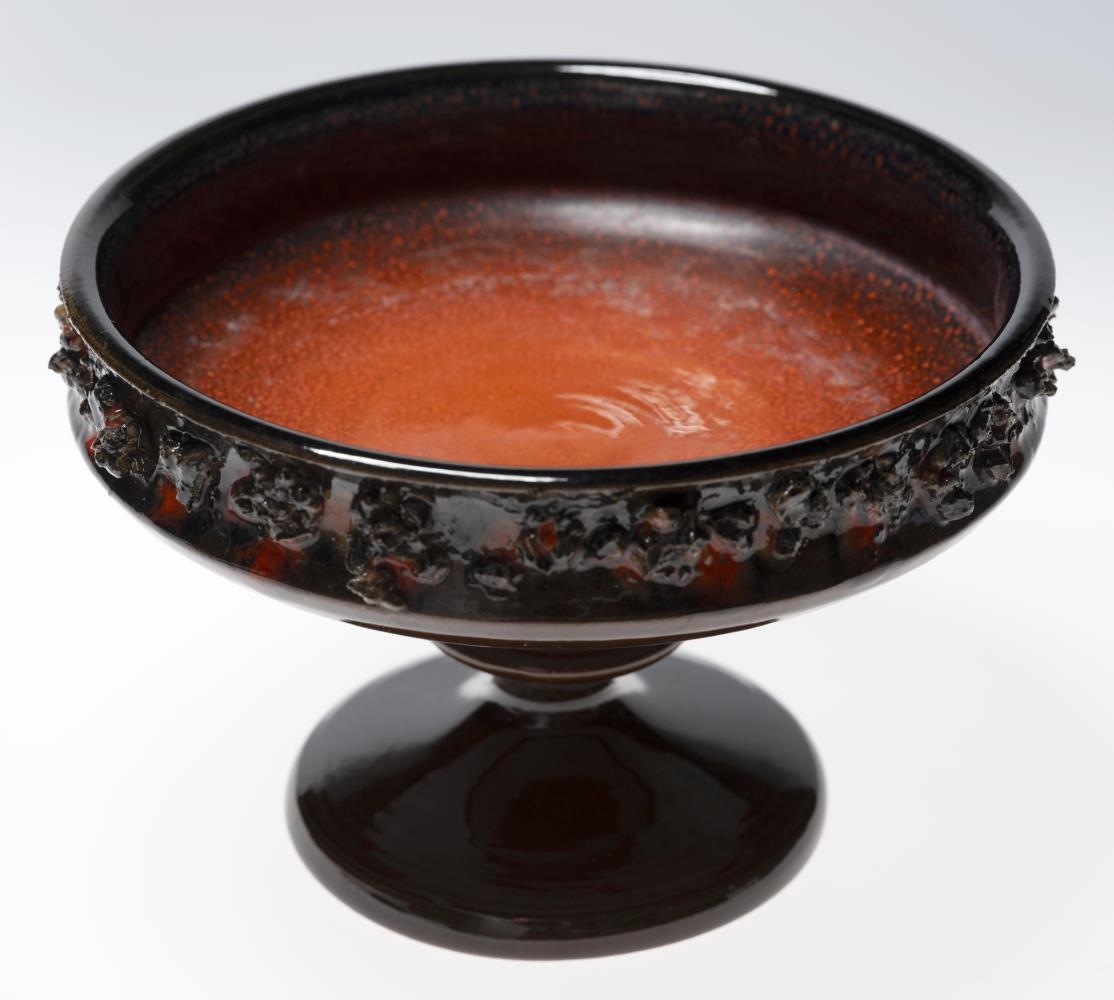 Skál á fæti með hraunáferð. Á utanverðri skálinni er hraunmulningur með brúnum og appelsínugulum glerungi. Ofan í skálinni er appelsínugulur glerungur en að öðru leyti er skálin brún að lit. Neðan á skálina er þrykkt merki Funa (teikning af sólarupprás og texti: Funi Ísland) og texinn Handmade in Iceland. Skálin er í góðu ásigkomulagi. Hæð 13,5 cm, þvm. 20 cm.