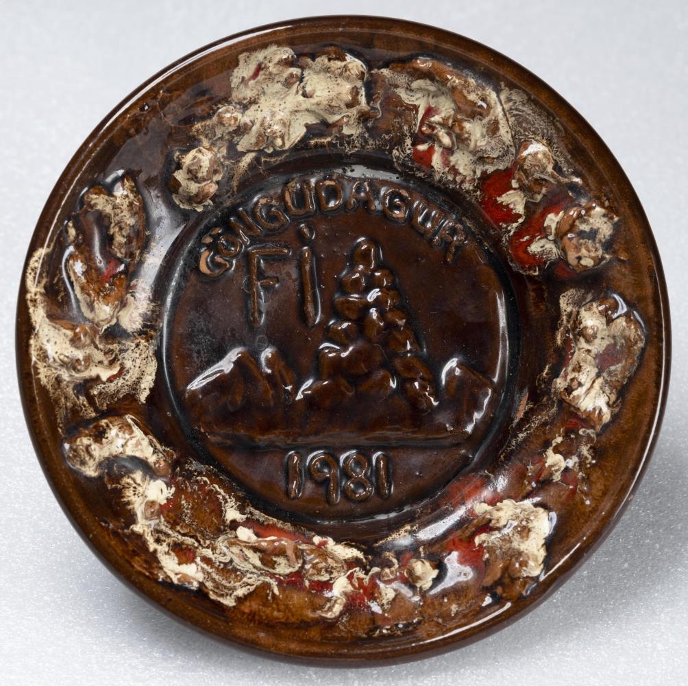 Brún skál með hraunáferð og merki Ferðafélags Íslands. Á innri barmi skálarinnar er hraunáferð mótuð í leirinn og lituð með hvítum og rauðum glerungi. Aðeins hefur brotnað upp úr hraunáferðinni á nokkrum stöðum. Á miðri skálinni er merki Ferðafélags Íslands mótað í leirinn og þar stendur Göngudagur FÍ 1981 með upphleyptum stöfum. Glerungurinn er brotinn á nokkrum stöðum á bókstöfunum. Meðfram miðjunni má sjá á tveimur stöðum leifar af vaxi. Á skálinni utanverðri eru sprungur í glerungnum. Neðan á skálinni hefur glerungurinn aðeins brotnað meðfram kantinum en þar er eftirfarandi merking: Iceland SA Handmade. Stærð: Hæð 4 cm, þvermál: 16,2 cm, þvermál um botn 10,5 cm.
