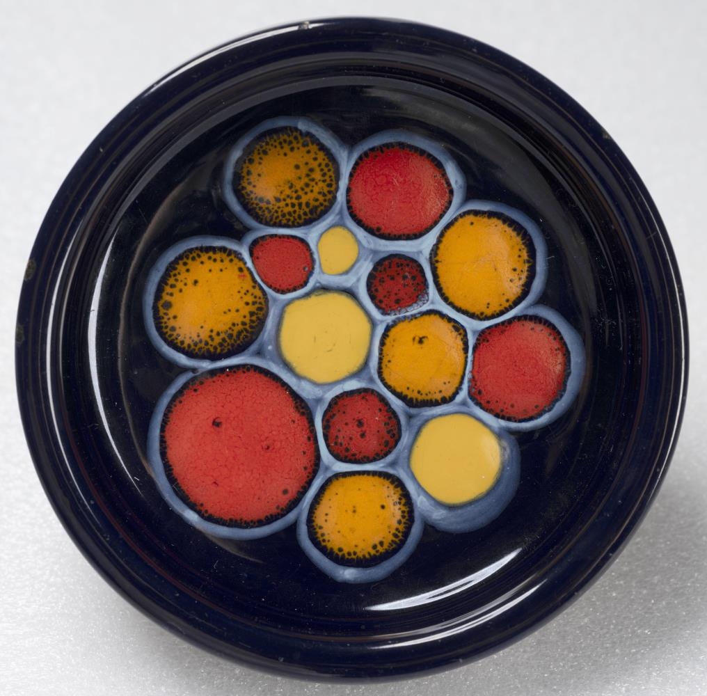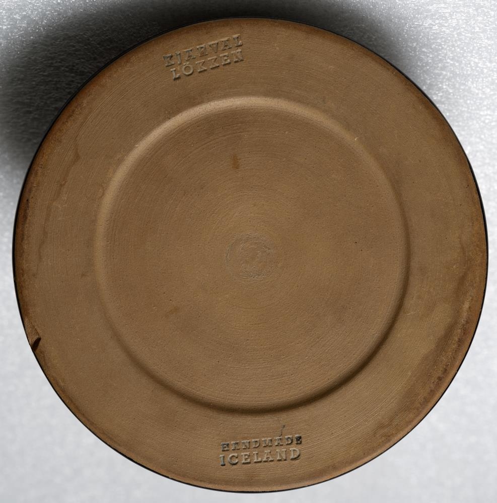 Dökkblá keramik skál með hringformum. Skálin er búin til af hjónunum Tove Kjarval og Robin Lökken. Neðan á skálina er þrykkt: Kjarval Lökken, Handmade Iceland. Skálin er skreytt með misstórum hringformum í gulum, rauðum og appelsínugulum lit. Umhverfis hringina er hvítur glerungur sem verður ljósblár ofan á dökkbláa glerungnum. Á fjórum stöðum á barmi skálarinnar hefur aðeins brotnað upp úr glerungnum en litað hefur verið í götin, hugsanlega með penna til þess að þau væru ekki jafn áberandi. Meðfram botninum hefur brotnað upp úr leirnum á einum stað. Hæð: 2,5 cm, þvm. 14,4 cm.