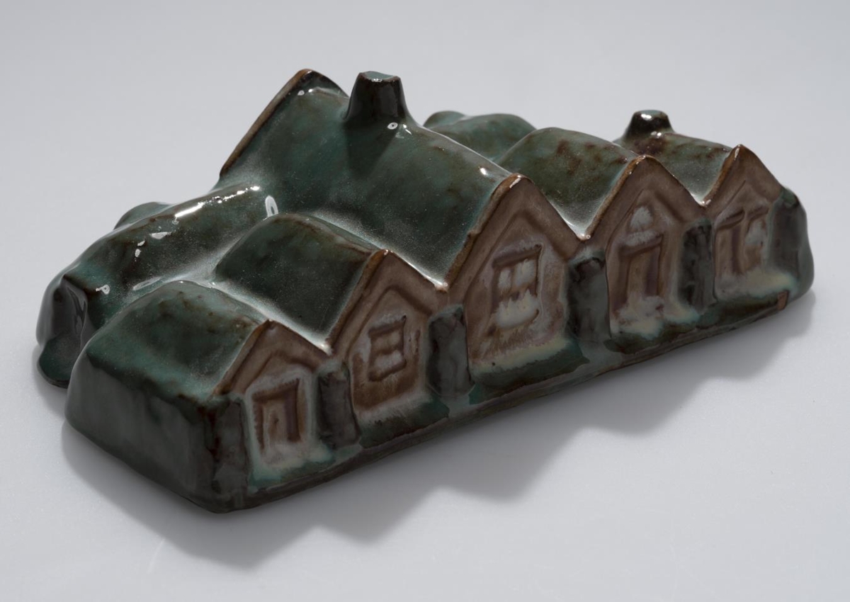 Burstabær úr keramiki. Neðan á burstabæinn er þrykkt merki Funa (teikning af sólarupprás og textinn Funi Ísland). Burstabærinn er í góðu ásigkomulagi. Hæð 5 cm, lengd 15,5 cm, breidd 8 cm.