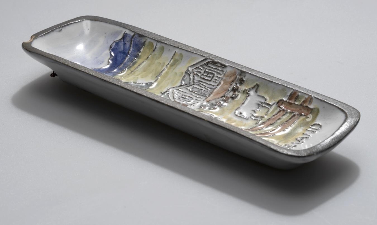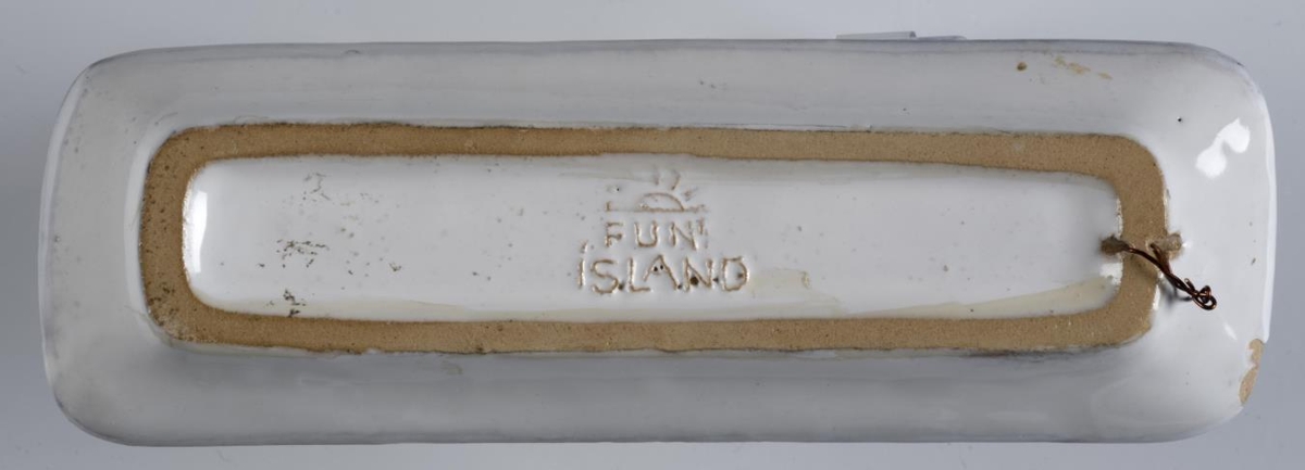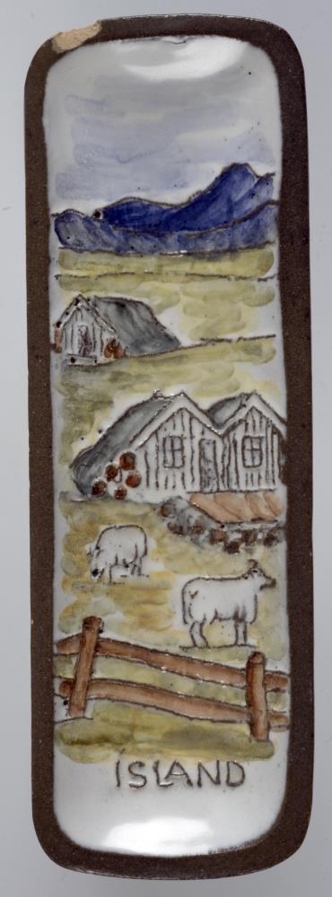 Veggplatti Ísland. Veggplatti, lítill, úr brenndum leir, ferhyrningslaga með rúnuðum hornnum og lagi grunnrar skálar. Framan á plattanum er sveitamynd með fjalli, burstabæ, tveimur kindum og girðingarbút. Aftan á plattann er þrykkt merki Funa (teikning af sólarupprás og textinn: Funi Ísland). Aftan á plattanum er gat sem búið er að þræða vír í. Hæð: 16 cm, dýpt: 1,5 cm, breidd 5 cm.