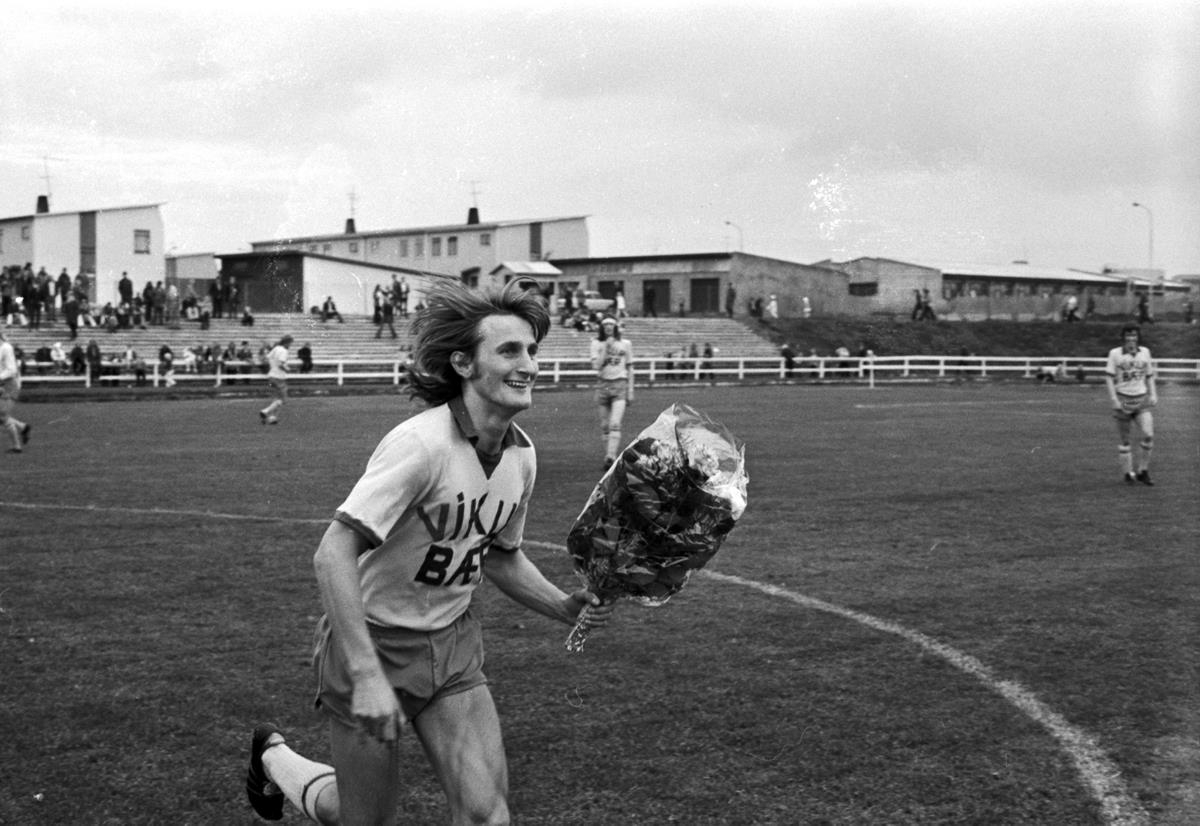 Íslandsmeistarar Íþróttabandalags Keflavíkur í knattspyrnu karla 1973. Steinar Jóhannsson á hlaupum með blómvönd í hendi