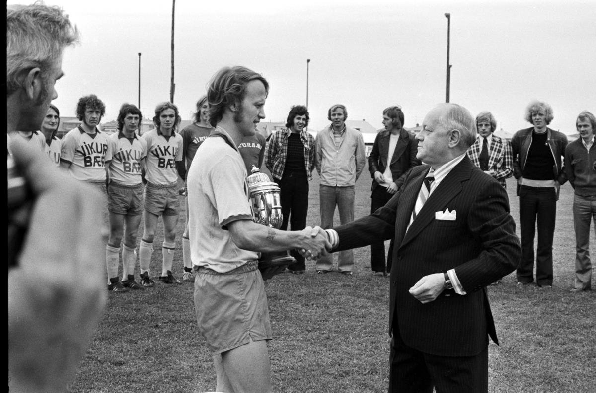Knattspyrnulið Íþróttabandalags Keflavíkur tekur á móti Íslandsmeistarabikarnum 1973. Guðni Kjartansson, fyrirliði, með bikarinn