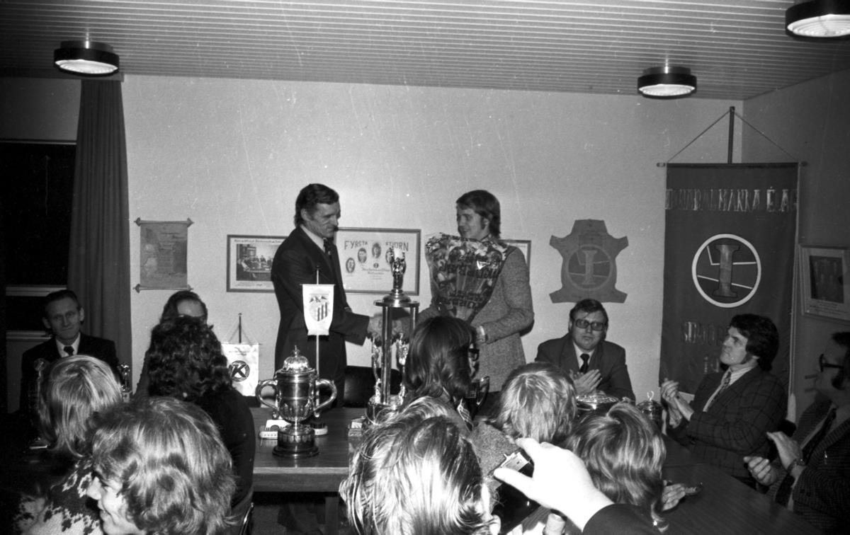 Afhending viðurkenniga 1974, íþróttamaður ársins og lið Íþróttabandalags Keflavíkur. Guðni Kjartansson tekur við blómvendi frá Hafsteini Guðmundssyni