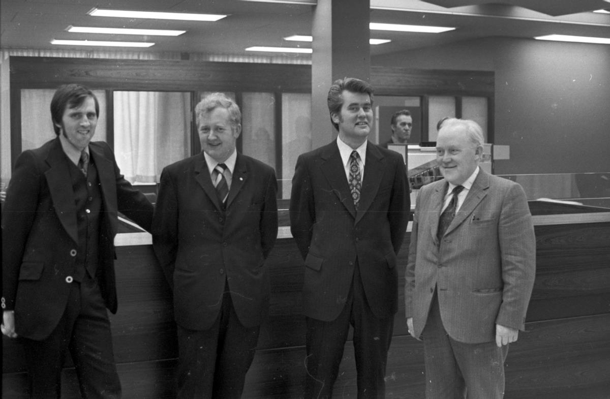 Frá opnun nýs húsnæðis Útvegsbankans í Keflavík. F.v. Helgi Hólm, Jón Pétur Guðmundsson, Jón Ísleifsson og Valtýr Guðjónsson.