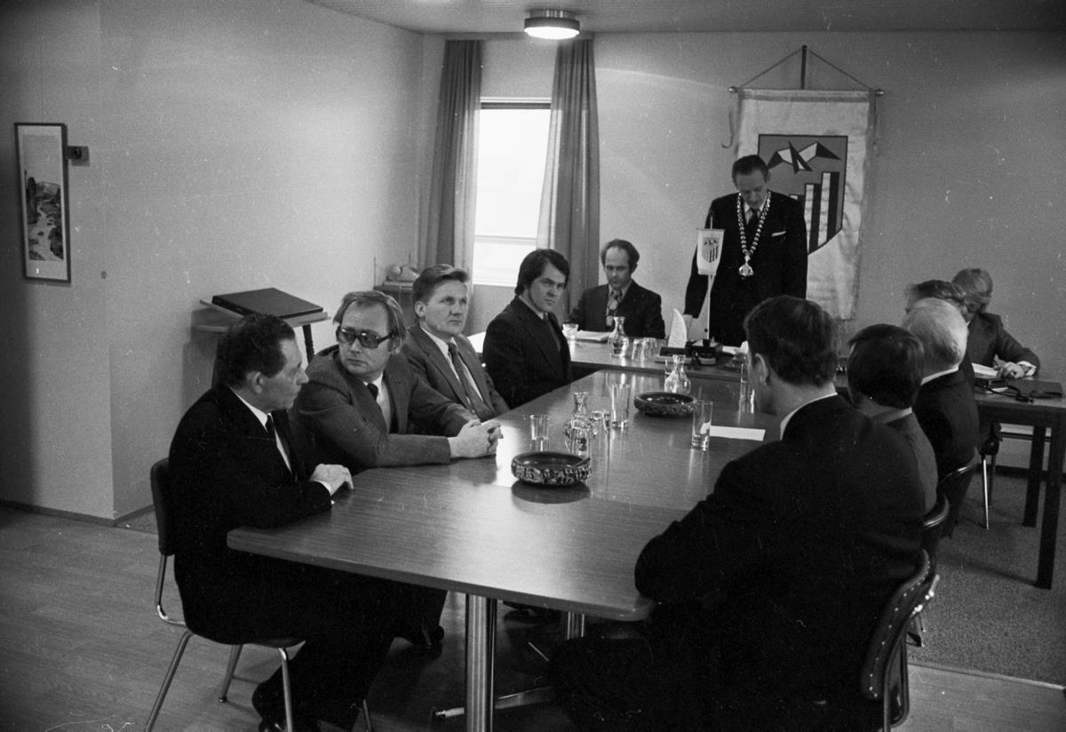 Keflavíkurbær 25 ára. Tómas Tómasson, forseti bæjarstjórnar, heldur ræðu á bæjarstjórnarfundi