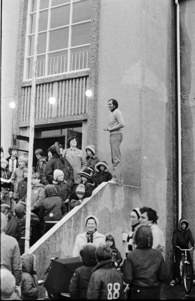 Frá trimmkeppni vinabæja Keflavíkur 1978. Helgi Hólm stendur á handriðinu á tröppum Barnaskólans og ávarpar mannfjöldann
