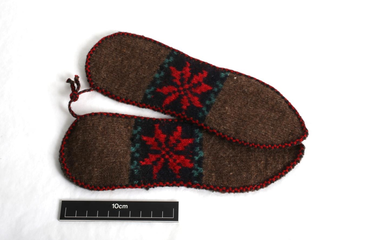 Mórauðir íleppar með áttblaðarós, rauðri. Kristbjörg Kristjánsdóttir (9.apríl 1872 - 30. júní 1962), húsfreyja í Litla Sandfelli, spann bandið, prjónaði íleppana og slyngdi snúrunar utan um.