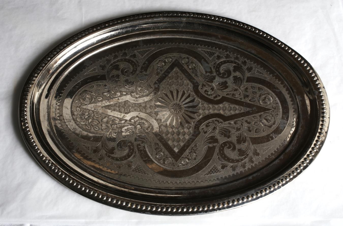 Sporöskjulaga málmbakki sem kaffi og aðrar veitingar voru bornar fram á. Munstur er í botni bakkans.