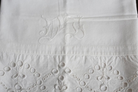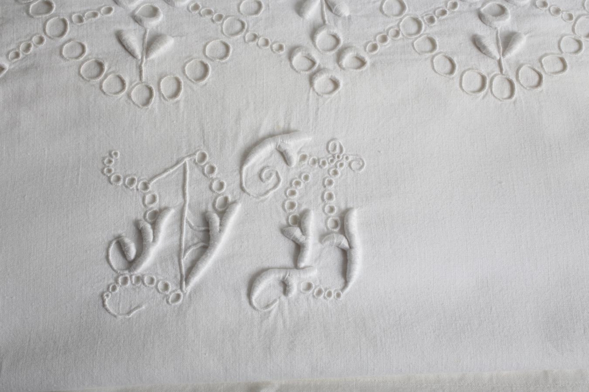Sængurföt sem Jónína Vilborg Jónsdóttir (1906-1990) saumaði. Líklega eru stafirnir "VJ" saumaðir þarna út, hennar stafir. Einnig er útsaumað gatamunstur.