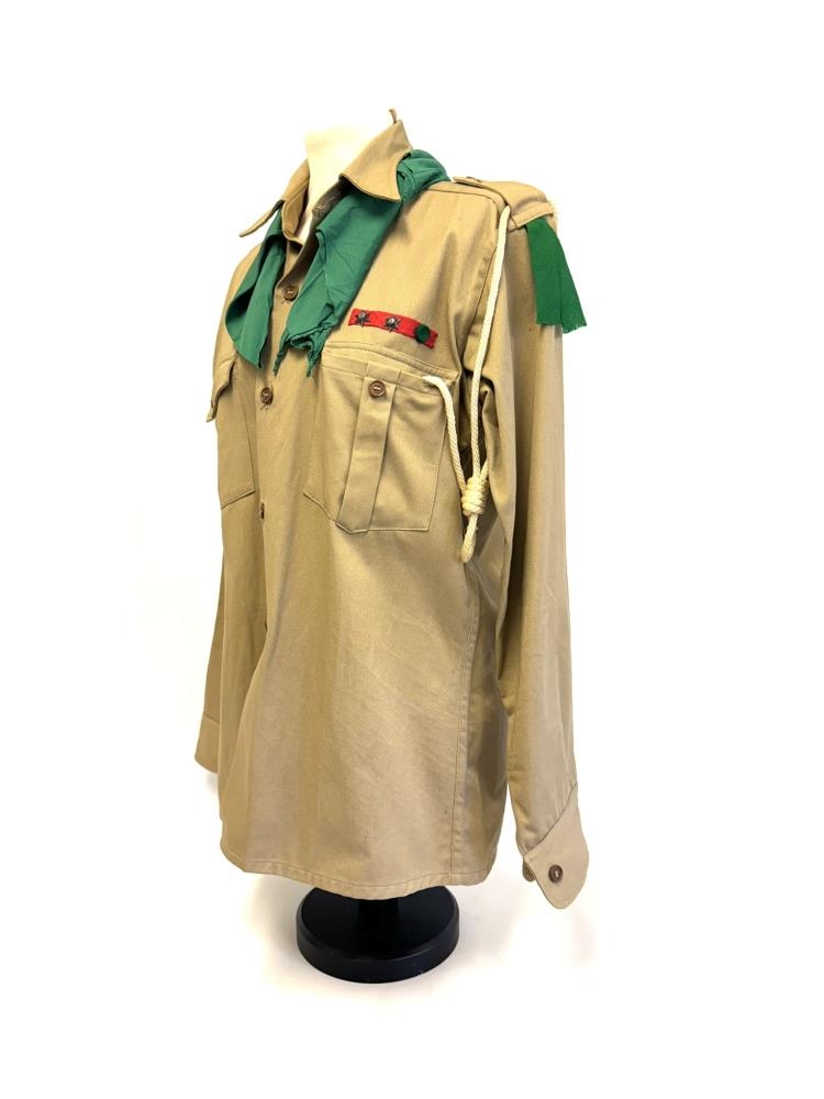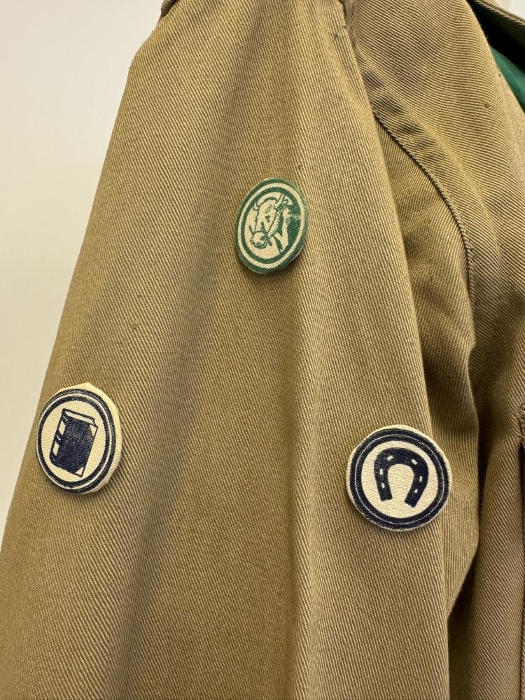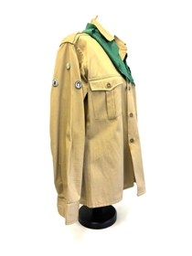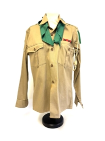 Skátaskyrta, ljósbrún-grænleit. Grænn klútur. Í skyrtuna eru saumuð þrjú merki á aðra ermina, lítil hringlaga merki með myndum af; bók, skeifu og hesti. Tveir brjóstvasar eru framan á skyrtunni, yfir öðrum þeirra er saumaður rauður borði og á hann eru fest þrjú merki, stjörnur. Grænt efni fest á axlir og hvítt band með hnút er tengt frá öxl að brjóstvasa.