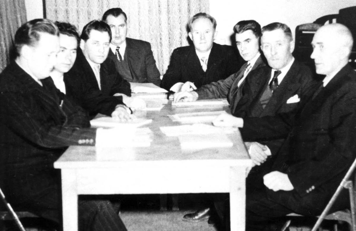 Fyrsti bæjarstjórnarfundur Keflavíkurbæjar. F.v. Jón Tómasson, Ásgeir Einarsson, Ragnar Guðleifsson bæjarstjóri, Arnbjörn Ólafsson ritari bæjarstjórnar, Valtýr Guðjónsson, Ólafur A. Þorsteinsson, Ingimundur Jónsson og Guðmundur Guðmundsson.