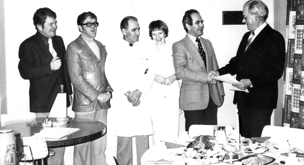 Guðmundur Jóhannsson afhendir sinn hlut í húseigninni Túngötu 23 í minningu um foreldra sína árið 1978. Eyjólfur Eysteinsson, Albert Sanders, Kristján Sigurðsson, læknir, NN, Jóhann Einvarðsson og Guðmundur Jóhannsson.