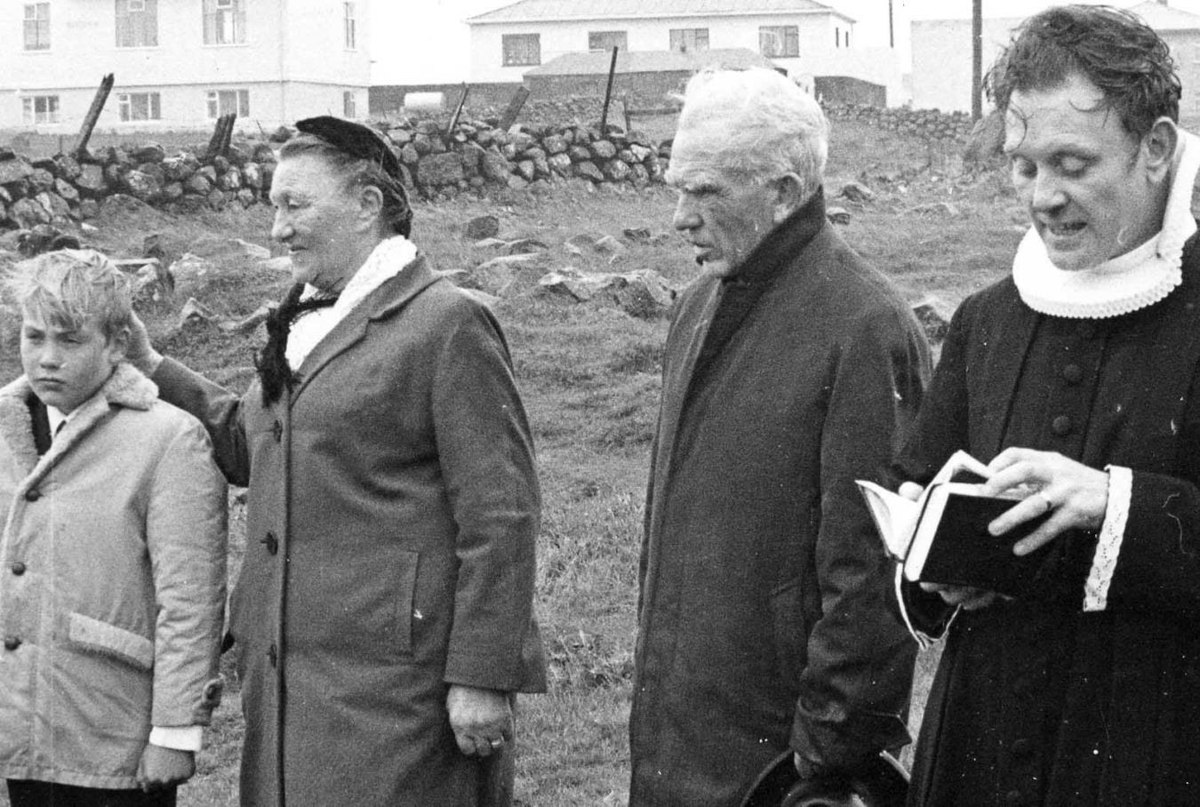 Fyrsta skóflustungan að kirkju í Ytri Njarðvík 13. sept. 1970. Ungur drengur, frú Guðlaug Stefánsdóttir frá Þórukoti, séra Garðar Þorsteinsson og séra Björn Jónsson.