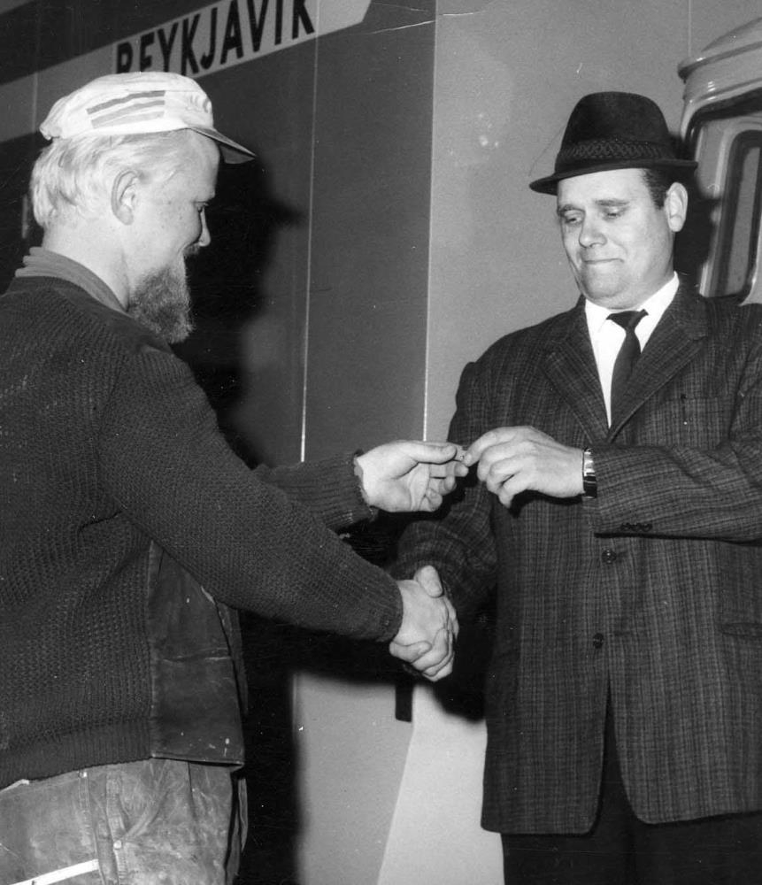 Birgir Guðnason afhendir Sigurði Markússyni lyklana að bílnum (sjá mynd Safnið 104098) nýyfirbyggðum og fullunninn á verkstæði Birgis, Grófinni 7, árið 1970.