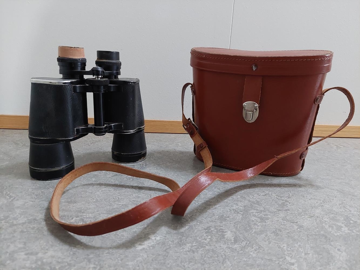 Kíkir í tösku. Taskan er 21 cm á lengd, 8,5 cm á breidd og 19 cm á hæð úr brúnu leðri með rauðu klæði innan í. Taskan er með axlaról og einfaldri læsingu framan á. Kíkirinn sjálfur er 18,5 cm á hæð og 19 cm á breidd þar sem hann er breiðastur. Á hann er skrifað: „SAMOHTA 7 x 50 TRIPLE TESTED“ og „HARD COATED OPTICS“.