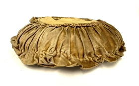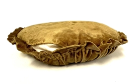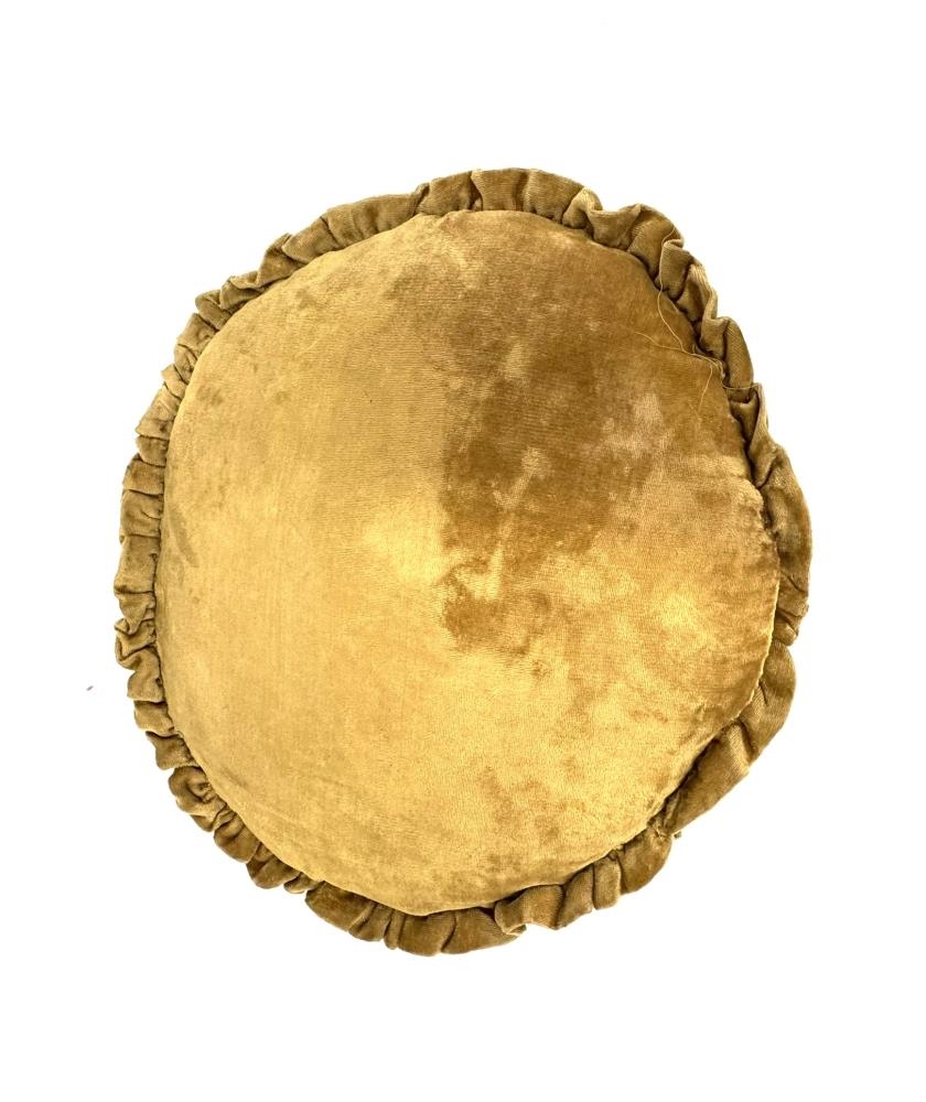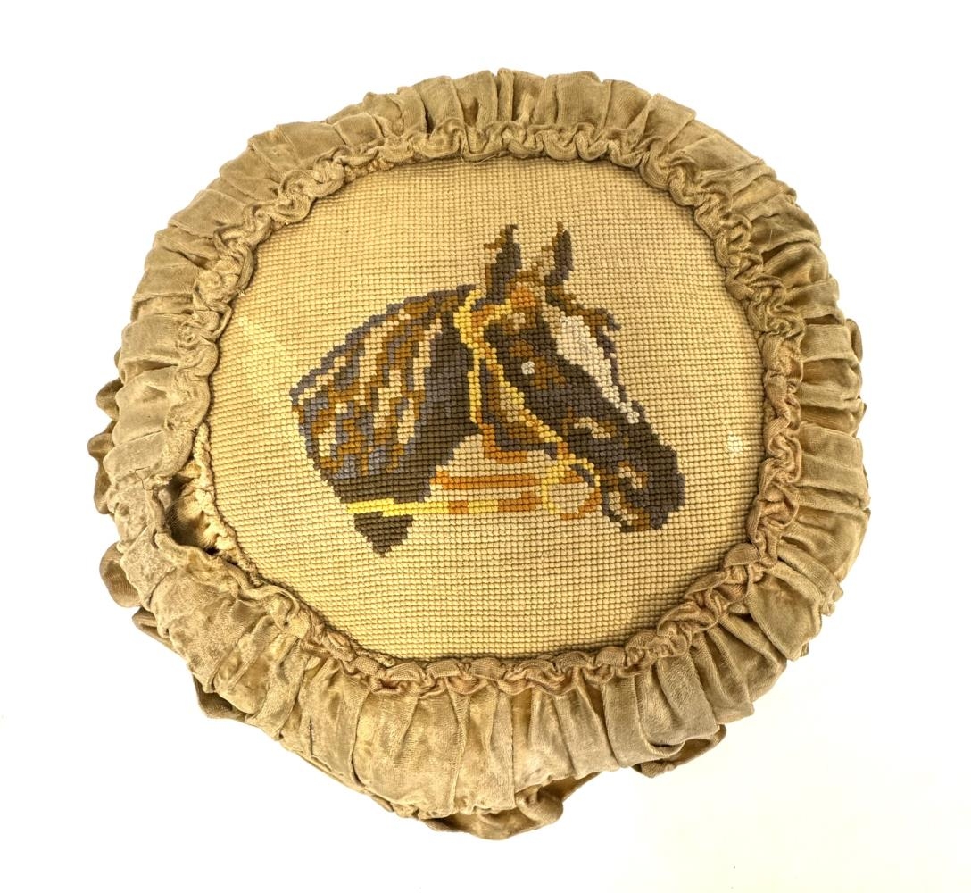 Gulbrúnleitur hringlaga púði. Efnið er flauel en framhliðin er öll útsaumuð, mynd af hesti. Rykkingar allan hringinn. Komin rifa á eina rykkinguna sem losnar þannig frá púðanum, einnig er saumurinn á púðanum sjálfum búinn að opnast á einum stað.