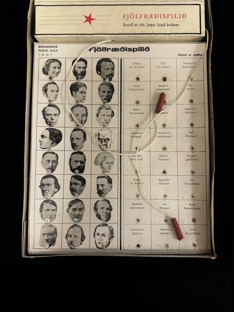 Spurningaspil. Kassi með spilinu Fjölfræðispilið. Leikurinn inniheldur nokkur spjöld með gátum sem þarf að para saman með því að þrýsta á það sem tengist og þegar rétt atriði parast saman kviknar ljós.