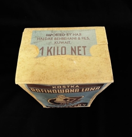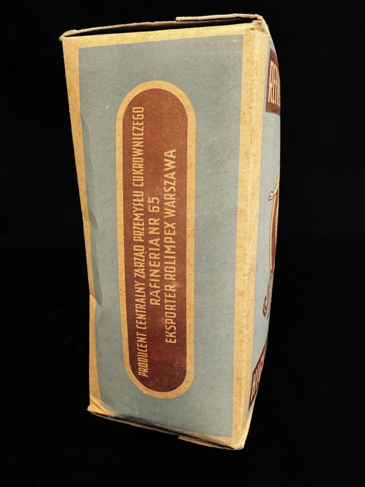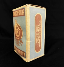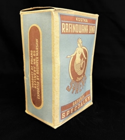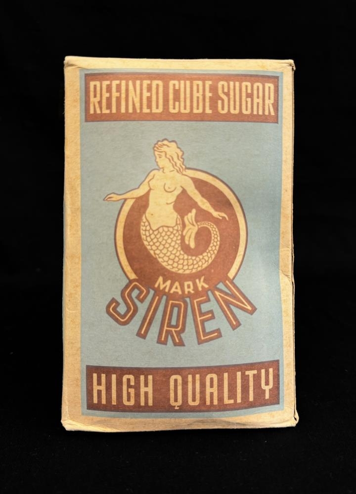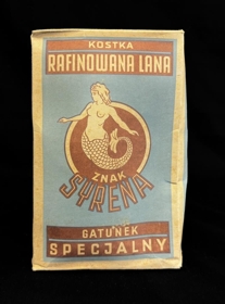 Sykur, kassi með sykurmolum í. Blár og ljós/brúnn á lit með mynd af hafmeyju. Framleitt í Póllandi. Á kassanum stendur bæði á ensku og pólsku; Refined cube sugar. Mark Siren. High quality. Product of Poland. Refinery nr. 65. Exported by Rolimpex Warsaw. Kostka. Rafinowana Lana. Znak Syrena. Gatunek Specjalny. Producent Centralny Zarzad Przemyslu Cukrowniczegd. Rafineria nr 65. Exporter Rolimpex Warszawa. Imported by Haji Haidar Behbehani & fils. Kuwait. 1 kilo net.