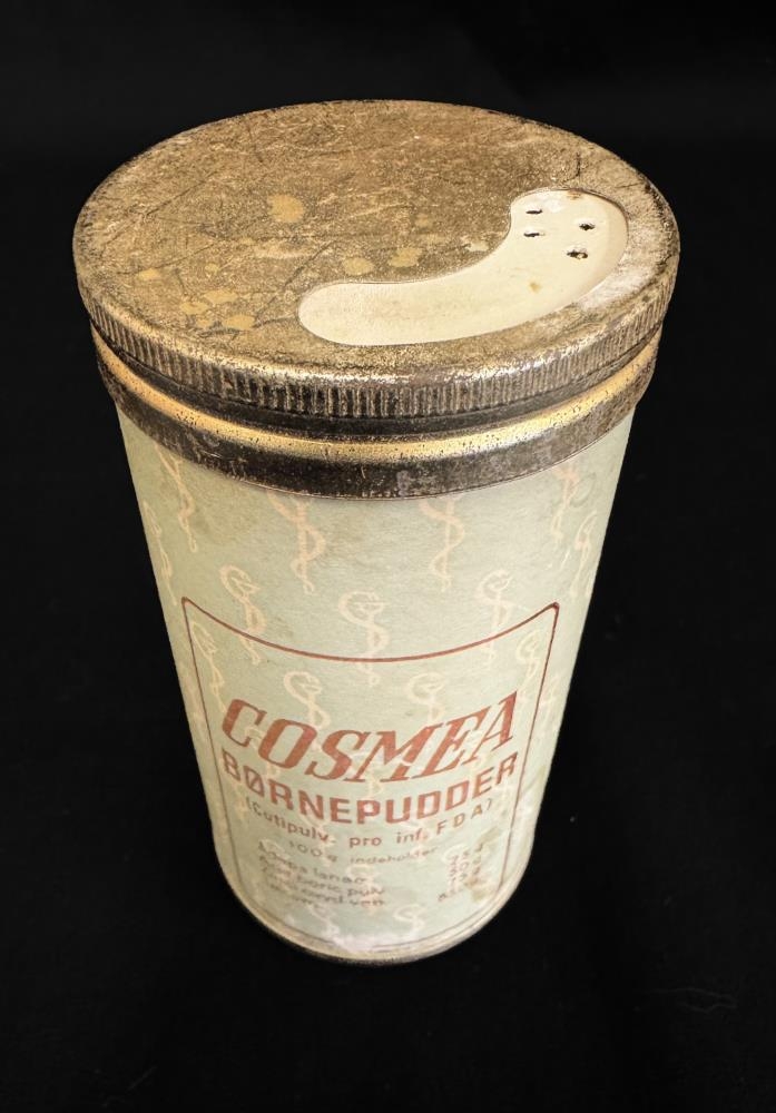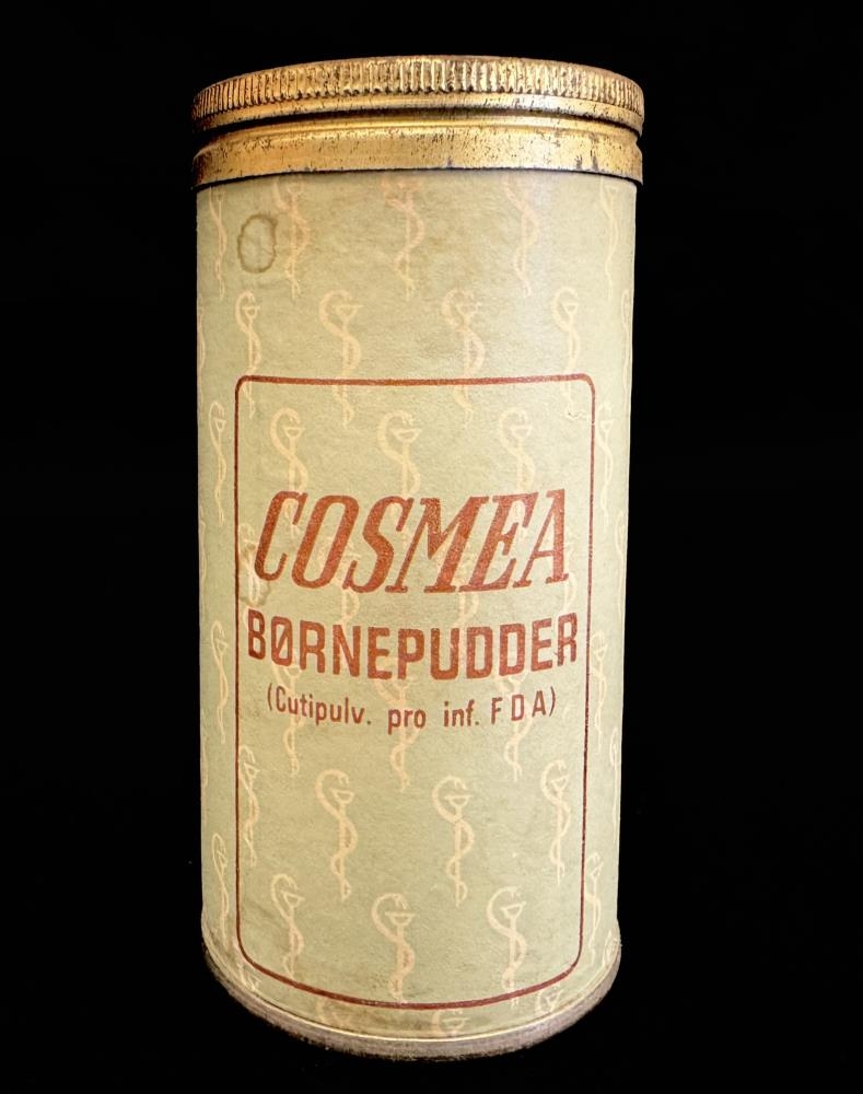 Barnapúður í dós. Dósin er úr málmi en pappírsmiði er allt í kringum staukinn, fölblár með brúnum stöfum. Lokinu er hægt að snúa þannig að það opnast fyrir lítil göt svo hægt sé að sáldra púðri úr dósinni og loka svo fyrir með því að snúa. Á bauknum stendur; Cosmea Bornepudder. (Cutipulv. pro inf. FDA). 100 g indeholder: Adeps lanae 2,5g. Acid Boric pulv. 5.0g. Zinci oxyd.ven. 7,5g. Talcum 85.0g. Bang og tegner A/S.