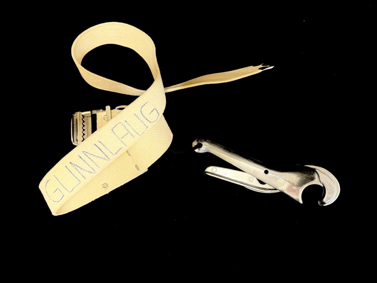 Skíðalyftubelti. Belti með krók til að krækja í skíðalyftur. Merkt Gunnlaug.