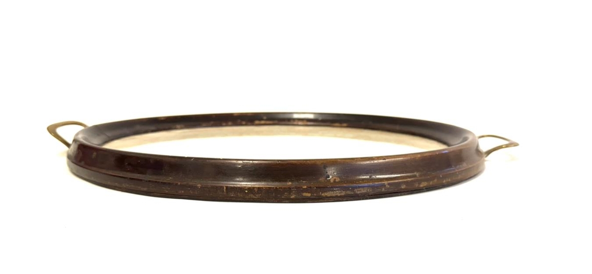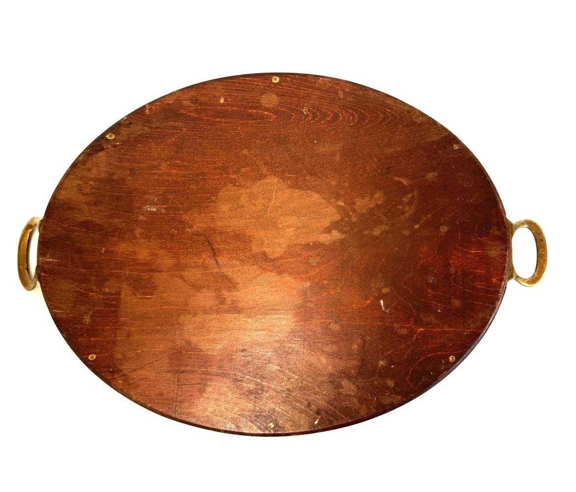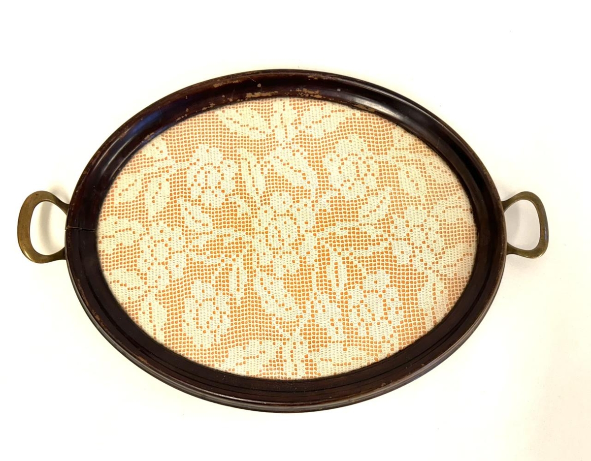 Glasabakki með útsaum. Bakkinn sjálfur er úr viðarefni með tveimur litlum málm haldföngum til endanna. Bakkinn er sporöskjulaga. Í botni bakkans er appelsínugult efni í grunninn en yfir því liggur útsaumað stykki með blómamunstri, hvítt, og þekur allan botninn. Yfir þessu er gler. Olivia Alvilda heklaði dúkinn.