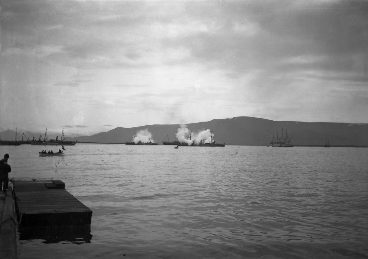 Fremst t.v. sér í Steinbryggjuna á úti á ytri höfninni hleypa herskipin af fallbyssu-púðurskotum til heiðurs Konungi.