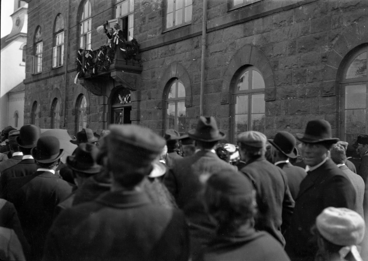 Mannfjöldi fylgist með konungi á svölum Alþingishússins.