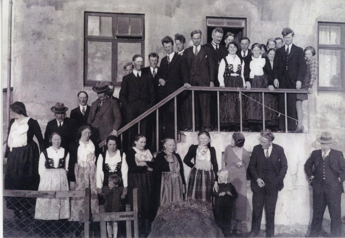 Prúðbúið fólk við steinsteypt hús. Hópmynd af gestum í skírnarveislu Sigríðar Lýðsdóttur f. 1935 í Litlu-Sandvík í Sandvíkurhreppi. Myndin er tekin við vesturhlið hússins.