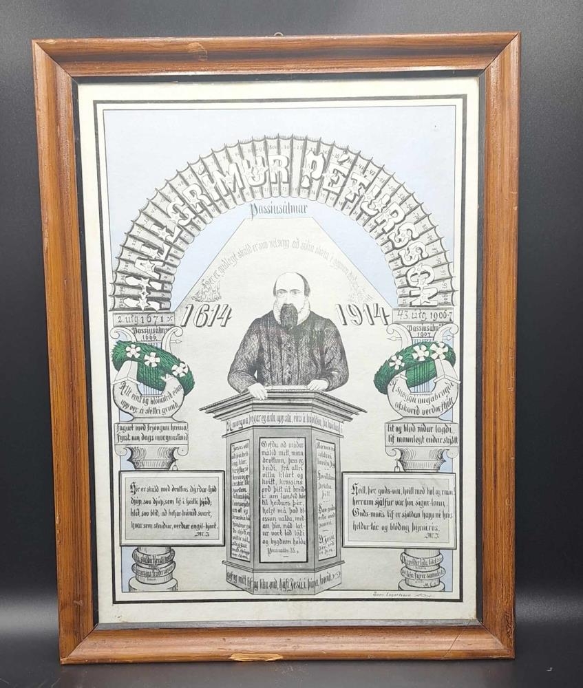 Alþekkt mynd af Hallgrími Péturssyni sálmaskáldi í ramma.