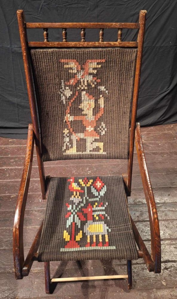 Stóll sem Anna Eymundsdóttir yngri (f. 22. jan. 1944) átti. Hann er meira en 100 ára. Var smíðaður af Magnúsi Magnússyni smið á Hólmavík (1868-1931), fyrir konu hans Önnu Eymundsdóttur eldri (1877-1968). Áklæðið var ofið af tengdamóður hans Guðbjörgu Torfadóttur (1845-1923). Mynstrið teiknaði síðan dóttursonur Guðbjargar, sonur Magnúsar smiðs, Tryggva Magnússyni teiknara (1900-1960). Hægt er að leggja stólinn saman.