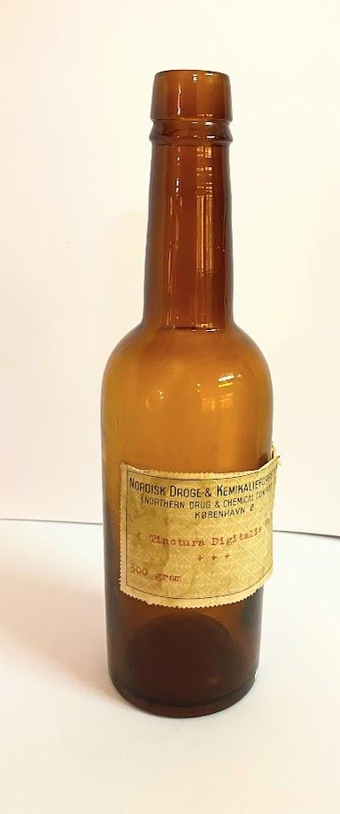 Flaska, dökk, undan Tinctura Digialis, frá apoteki í Kaupmannahöfn. Líklegast frá Jóni Árnasyni fyrrv. héraðslækni í Öxarfirði.