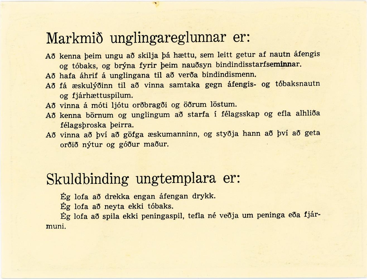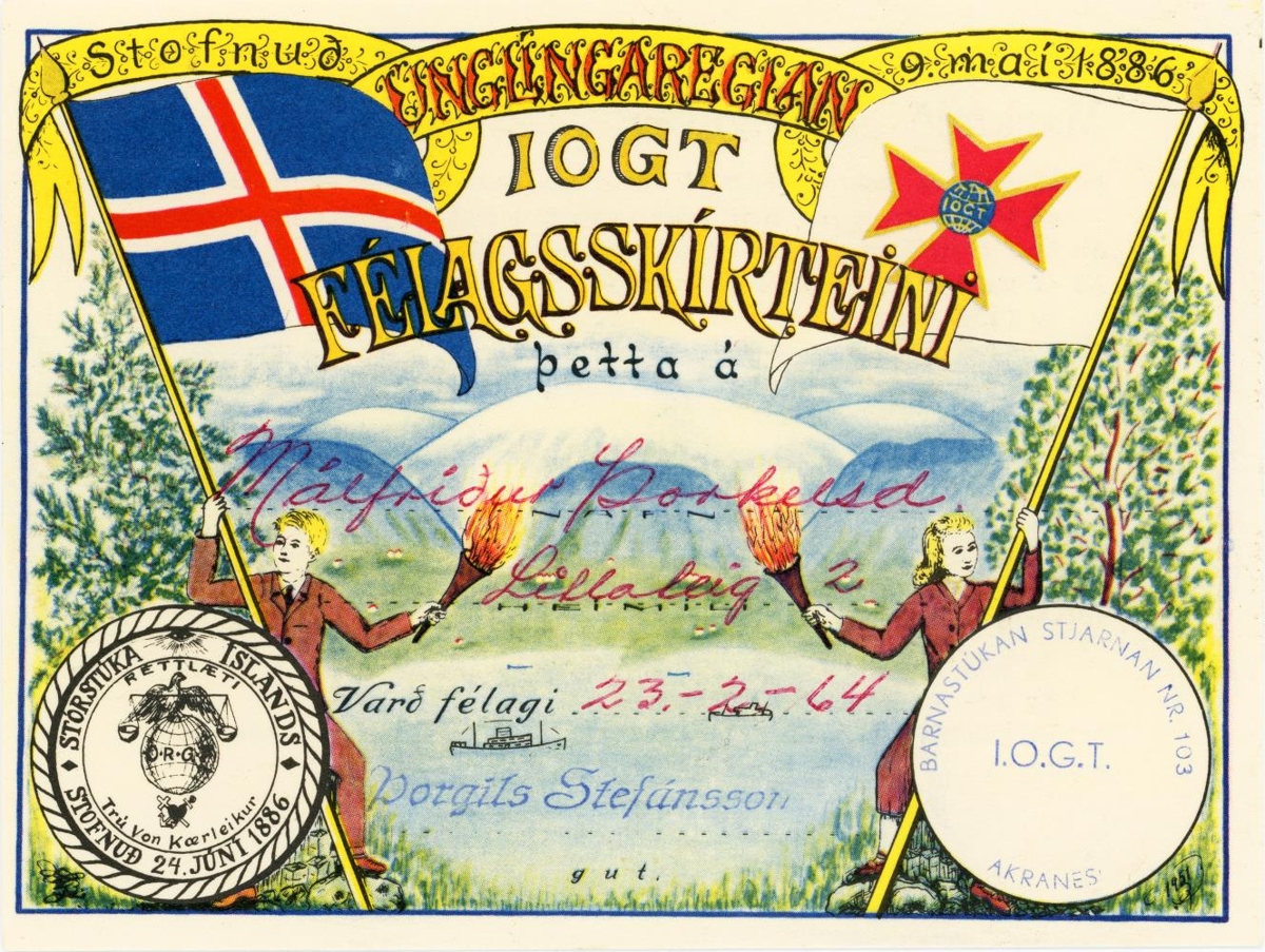 Texti: Unglingareglan IOGT Félagsskírteini þetta á Málfríður Þorkelsdóttir. Varð félagi 23-2-64. Þorgils Stefánsson