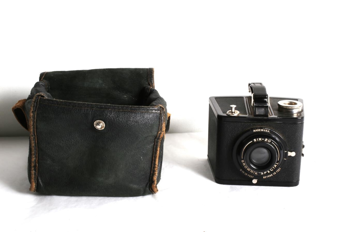 Ljósmyndavél í svart leðurtösku. Gerðin er "SIX-20 'BROWNIE' C, MADE BY KODAK". Utan um vélina er leðurtaska, svört á lit. Taskan er illa farin. Myndavélin úr búi foreldra gefanda, þeirra Hans Kristins Aðalsteinssonar og Láru Ásgerðar Albertsdóttur.